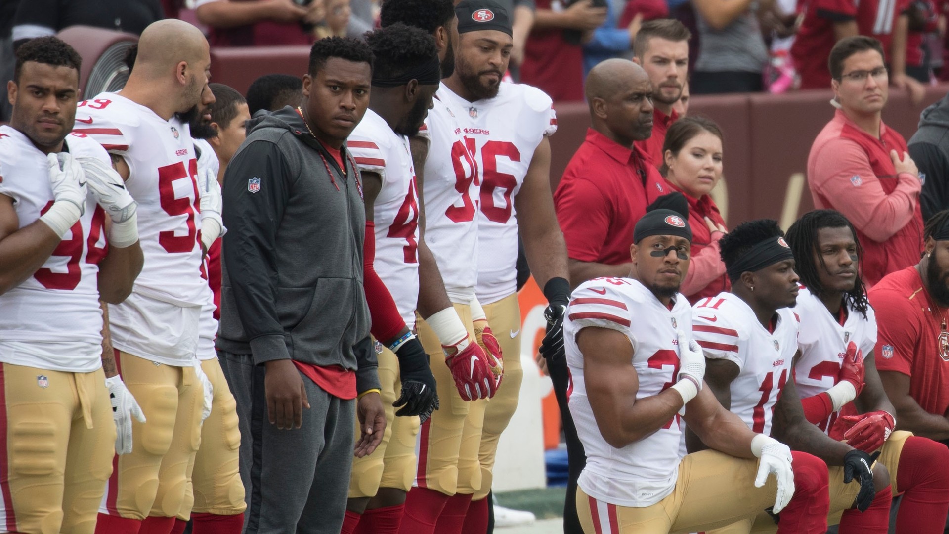 Nfl Spieler / NFL Roster: Alle gecutteten Spieler im Überblick / Die anderen spieler schauen vom spielfeldrand aus zu und tragen dabei nfl caps oder nfl hoodies ihres teams.
